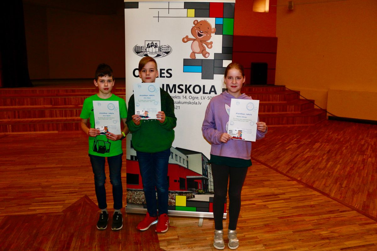Apbalvojām Ogres sākumskolas skolēnus par piedalīšanos skolas skatuves runas konkursā ZVIRBULIS 2022, par angļu un krievu valodu olimpiādēm un par starptautisku konkursu Ziemas zinātņu karaliene.